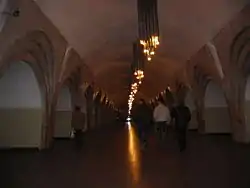 Пілони мають звужену ширину і велику глибину. Проходи між центральним і колійними залами виконані у вигляді багатошарових арок. В оздобленні пілонів і колійних стін використано білий і бежевий мармур. Підлога оздоблена темно-червоним гранітом. Оригінальні люстри центрального залу у вигляді зв'язок з металевих рур (раніше лампи світили і з нижнього, і з верхнього боку «рур», зараз світять тільки вниз). Бічні платформи підсвічуються ртутними світильниками в нішах пілонів (раніше і центральний зал додатково підсвічували з ніш лампами розжарювання, але зараз цього немає).