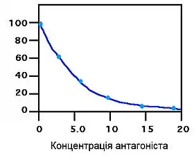 За визначенням, антагоністи ефективності не виявляють.[5] Після зв'язування з рецептором антагоніст пригнічує ефекти агоністів, зворотних агоністів, та інших антагоністів. При фармакологічному аналізі ефектів антагоністів використовується крива доза-ефект, яка ілюструє здатність різних концентрацій (або доз) антагоністів пригнічувати ефект агоніста.[9]Ефективність антагоніста звичайно визначається за величиною його ІС50. Тобто, чим менша величина ІС50, тим менша концентрація антагоніста потрібна для досягнення бажаного ефекту; тому в фармакології пошук нових лікарських засобів часто ведеться в напрямку речовин з низькими ІС50: це дозволяє запобігати розвиненню побічних ефектів при їхньому застосуванні.[10][11]