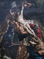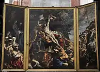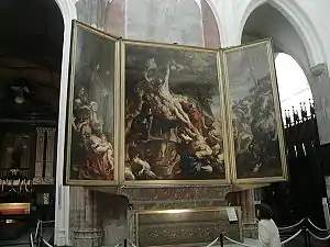 Триптих. Основу становить монументальне полотно з однойменною назвою. Середня панель була закінчена в 1612, бічні панелі було додано згодом. Розміри: передня панель 4,21×3,11 м, дві бічні панелі 4,21×1,53 м. Це одна з найвідоміших картин майстра і один з найвизначніших шедеврів живопису бароко. Написана на замовлення ордену мушкетерів, покровителем якого є Святий Кристофер. (Його і зобразив художник на лівому краю композиції) Ці обидві роботи було вилучено з собору і відвезено до Франції Наполеоном, але повернуто в храм в XIX столітті.