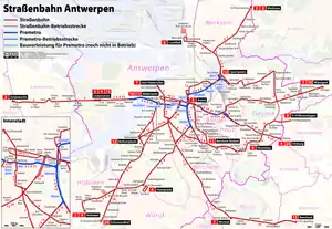 У теперішній час (2000-ні) мережа антверпенського трамваю включає ділянки, що мають різний характер — від вуличних трас на суміщеному полотні до підземних тунелів, що мало відрізняються від метрополітену. Таку систему підземних ліній в Антверпені, як і в Бельгії в цілому, прийнято називати «пре-метро».
