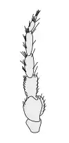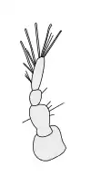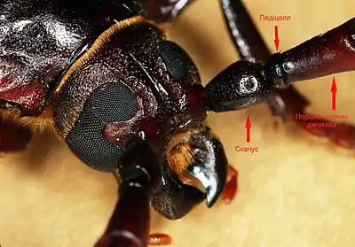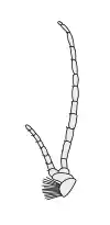 Типова антена комах складається з потовщеного базового членика (скапуса), ніжки (педіцелла) — другого знизу членика; сукупність решти члеників утворюють джгутик (флагеллум). У личинок вусики коротші і тонкіші, ніж у імаго[6]. До скапусу кріпляться м'язи, які рухають всією антеною.
