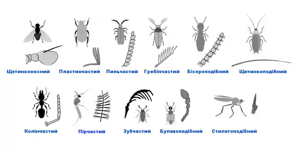 Усі дорослі комахи мають одну пару антен на лицьовій частині голови. Це видозмінені кінцівки другого членика тіла, який в ході еволюції увійшов до складу голови. Антени закріплені, звичайно, поміж очима, в двох ямках, оточених кільцевим підвищенням. У ямці є вирост, до якого, власне, і кріпиться антена[5].