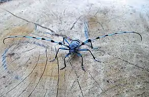 Комах родини Cerambycidae невипадково називають українською «жуки-вусачі». На фото — альпійська розалія (Rosalia alpina) |