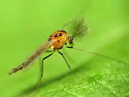 Самець комара з родини Хірономіди. У багатьох комарів самці мають антени, схожі на пухнасті пір'їни. У самиць же вони звичайні — непоказні, ниткоподібні |