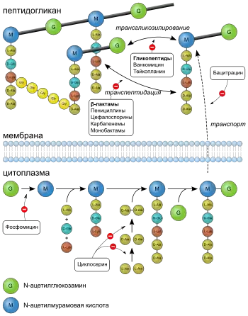 - Порушення синтезу клітинної стінки за допомогою інгібування синтезу пептидоглікану (пеніцилін, цефалоспорин, монобактами), утворення димерів і їх перенесення до ланцюгів пептидоглікану, що ростуть (ванкоміцин, флавоміцін), або синтезу хітину (ніккоміцін, тунікаміцін). Антибіотики, що діють за подібним механізмом мають бактерицидну дію, не вбивають клітини, що позбавлені клітинної стінки.
