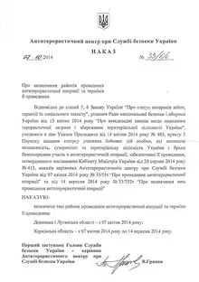 Наказ Антитерористичного центру при Службі безпеки України від 07.10.2014 р. № 33/6/а «Про визначення районів проведення антитерористичної операції та термінів її проведення»