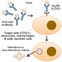 Антитіла, за своєю природою, сприяють фагоцитуванню вірусу імунними клітинами. Зазвичай фагоцитування комплексу вірус-антитіло супроводжується деградацією вірусу, але може, в разі антитілозалежного посилення інфекції, викликати, навпаки, реплікацію вірусу, з подальшою загибеллю імунних клітин. Таким чином, вірус як би «обманює» процес фагоцитозу імунних клітин і використовує антитіла господаря в якості «троянського коня». Механізм антитілозалежного посилення інфекції, який включає фагоцитоз імунних комплексів через рецептор FcγRII / CD32, вивчений краще, ніж механізм, що включає фагоцитування через рецептор комплементу. Клітини, що експресують FcγRII/CD32 рецептор, представлені моноцитами, макрофагами, деякими категоріями дендритних клітин, B-клітинами та іншими. Антитілозалежне посилення інфекції ускладнює розробку противірусних вакцин.