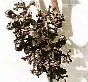 ![]() Плоди винограду, уражені антракнозом Плоди винограду, уражені антракнозом | |