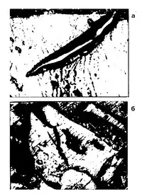 Фрагменти аншліфів вуглемасляних агломератів з порами й тріщинами заповненими масляним реагентом. х600