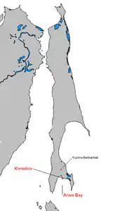 У затоці порт Корсаков, зв'язаний залізницею з Южно-Сахалінськом і місто Аніва