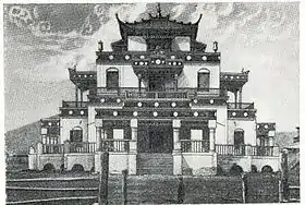 Після того, як в 1811 році в дацані згоріла дерев'яна будівля Цоґчен-дуґана, замість нього, за участю російських майстрів, було побудовано кам'яну. Дуґан представляв собою двоповерхову будівлю з балюстрадою, балконами, гротами і нішами. Перший поверх починався з висоти людського зросту. Замість даху була побудована кам'яна піраміда, висота якої, окрім двоповерхової будівлі, становила (за різними джерелами) від 10 до 15 метрів. Піраміду підтримувало 30 колон .