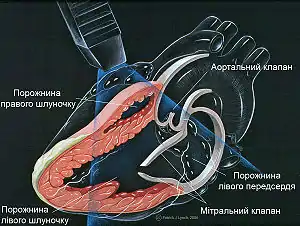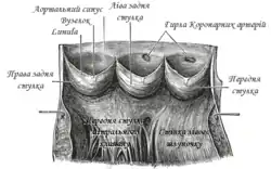 ![]() Аортальний клапан Поздовжній розріз аорти. | |