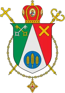 Блазон (геральдичний опис): У щиті срібне вістря, в якому синій круг із трьома золотими колосками, середній більший від двох обабіч; вгорі правого зеленого поля скошені навхрест два ключі вушками додолу, срібний і золотий; вгорі лівого червоного – золотий андріївський хрест. Щит увінчано золотою митрою з червоним підкладом і розміщено на покладених навхрест золотих процесійному хресті та єпископському жезлі, внизу – панагія.