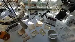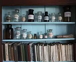 - Матеріальна кімната. Другий зал – це колишня матеріальна кімната, де зберігались запаси медикаментів. Тепер тут відтворено вигляд старовинної аптечної лабораторії - виставлено робочий стіл асистента, обладнання для миття та сушіння аптечного посуду, шафи для зберігання медикаментів тощо.