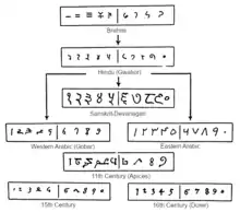 За відомостями Аль-Біруні, в Індії існувало декілька форм написання чисел, і "Араби вибрали серед них ті, що задавалися найбільш придатними". Аль-Насаві на початку одинадцятого століття писав, що математики не мали згоди щодо форми цифр, але більшість з них погодилася щодо навчання із використанням форм цифр, що зараз називаються східно-арабськими числами.[8] Найдавніші зразки написання цих цифр віком 873–874 рр. були знайдені в Єгипті, і з них можна побачити три форми написання цифри "2" і дві форми написання цифри "3", і ці різновидності в написані показують розбіжності, які були між тим що згодом стало відомо як Східні Арабські числа та (Західні) Арабські числа.[9]
