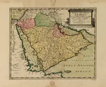 Французька «Мапа трьох Арабій, частково взята з арабської Нубії, частково з кількох інших авторів».Нікола Сансон, 1654 рік. Пустеля — невеличка зелена область на півночі. Велика жовта область — " Ємен ".