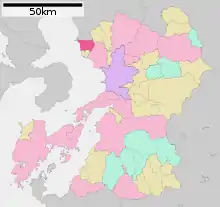 - Хіґашіде М. Історія міст префектури Кумамото. Адміністративний поділ Японії. (японською). Архів оригіналу за 27 червня 2013. Процитовано 20 вересня 2012.