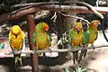Ліворуч - дорослий папуга, три зеленуватіших - молодші