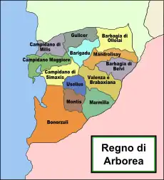 Адміністративно поділялася на 14 кураторій: Барбаджу ді Ості, Барбаджу ді Белві, Барбаджу ді Оллолай, Барігаду, Бонорзулі, Кампідано Маджоре, Кампідано ді Міліс, Кампідано ді Сімаксіс, Гульцер, Мандролісая, Мармілли, Монтіса, Уселлуса та Валенси. На чолі їх стояв куратор, якого призначав юдик.