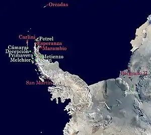 - Прімавера (ісп. Base Primavera) — база заснована 1977 року, розташована на Антарктичному півострові