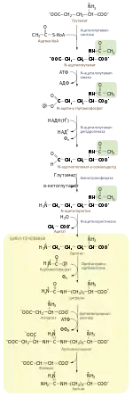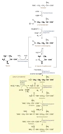 Біосинтез аргініну de novo розпочинається із глутамату, який фосфорилюється до γ-глутамілфосфату із використанням однієї молекули АТФ, після чого утворений продукт відновлюється до глутамат-γ-семіадьдегіду. Ці реакції каталізують глутаматкіназа та γ-глутамілфосфатредуктаза відповідно. Глутамат-γ-семіальдегід спонтанно циклізується у Δ1-піролін-5-карбоксилат (П5К), який далі може бути перетворений у пролін, проте під час біосинтезу аргініну глутамат-γ-семіальдегід повинен вступати в реакцію переамінування із глутаматом, внаслідок якої він перетворюється до l-орнітину. Рівновага реакції циклізації семіальдегу у П5К сприяє утворенню останнього, проте вона може протікати і в напрямку необхідному для синтезу орнітину, за умов нестачі аргініну в організмі. Орнітин також може бути синтезований із проліну, що окиснюється до П5К проліноксидазою[5][10].