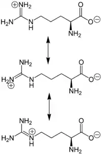 R-група аргініну складається із карбонового ланцюга довжиною три атоми, на кінці якого розташоване гуанідинове угрупування, завдяки якому ця амінокислота має сильні основні властивості. Коли аргінін перебуває в іонізованій формі, позитивний заряд у гуанідиновій групі рівномірно розподіляється між трьома атомами Нітрогену й атомом Карбону завдяки делокалізації електронів[6].