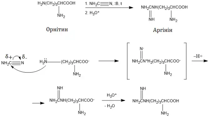 Основа: В пов'язує протон карбоксильної групи, після чого слідує нуклеофільна атака δ-NH2-групи (більш сильний нуклеофільний центр, ніж α-аміногрупа) по -зв'язку ціанаміду