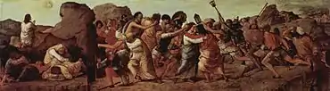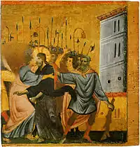 ...приходить Юда, один з дванадцятьох, і з ним багато народу з мечами та киями від первосвящеників, і книжників, і старших. <...> І, прийшовши, підійшов він негайно та й каже: Учителю! Учителю! і поцілував Його. А вони руки свої наклали на Нього, і схопили Його. <...> Тоді всі полишили Його й повтікали. Один юнак, загорнувшись по нагому тіла в покривало, йшов за Ним; і воїни схопили його. Але він, покинувши покривало, втік від них нагий. І привели Ісуса до первосвященика... |