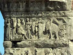 Місто представлене у вигляді воріт з двома баштами. У лівій частині композиції представлені три фігури літніх бородатих людей, які схиляються у покорі перед імператором (від його фігури збереглася тільки частина лівої ноги). Також присутні зображення полонених жінок з верблюдами (в центрі на другому плані і в правій частині перед воротами).