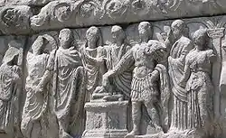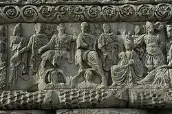 Імператор зображений в центрі, в цивільному одязі, що сидить в дорожньому возі, запряженому чотирма кіньми. Його супроводжують вершники в колетах і шоломах. Перед цією процесією зображено двоє дітей-рабів. Імператора вітають жінки.