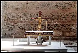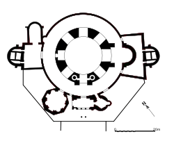 - для вівтаря розширена східна ніша, що призвело до порушення циліндричної форми стіни і після землетрусу в 11 столітті східна частина куполу зруйнована і потім посилена двома підпірними стінами;