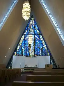 У вівтарній частині знаходиться вітраж, створений художником Віктором Спарре в 1972 році[1]. Картина зображає руку Бога, від якої виходять три промені світла, спрямовані на величезну фігуру Ісуса Христа і двох людей, що стоять поруч з ним. Як і в архітектурі церкви, тут активно використовується символізм числа «три».