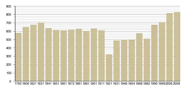Динаміка населення (base Cassini de l'EHESS pour les nombres retenus jusque 1962[3], base Insee à partir de 1968 (population sans doubles comptes puis population municipale à partir de 2006)[4] · [5] ):