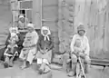 Традиційний спосіб проведення часу після відвідин Літургії. Літні люди з дітьми відпочивають біля стіни дому. Святковий день (ймовірно неділі). Село Середньовка Бугурусланського р-ну Самарської обл. — 1914 р.