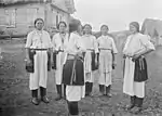 Ерзянський жіночий хор. Дівчина зліва вдягнена в ерзянський стрій. На ній видно панар (ерз. panar — "сорочка") і пулакаш (ерз. pulakš — деталь одягу, що покриває стегна). Село Середньовка Бугурусланського р-ну Самарської обл. — 1914 р.