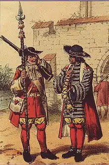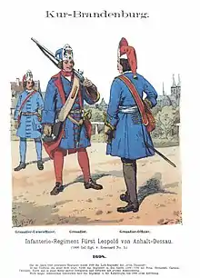До середини XVII ст. армія Бранденбурга-Пруссії не мала уніформи в сучачному значенні цього поняття. Причиною цього був нерегулярний характер армії та стан розвитку текстильних мануфактур, що не дозволяв налагодити масове виробництво одностроїв. За часів Фрідріха-Вільгельма становище починає змінюватися. Створюється регулярна армія, в котрій вже регламентується яким має бути спорядження та одяг вояків. Перші однострої виготовлялися з тканин темних кольорів (найбільш розповсюдженим був синій колір, що пізніше стане базовим для армії Пруссії). Це було пов'язано з тим, що тканини неяскравих та темних кольорів були дешевшими. Саме через це вони стали розповсюдженими серед бідних протестантських країн на півночі Європи, таких як: Швеція, Гессен-Кассель та Бранденбург-Пруссія. Натомість, на відміну від них армії католицьких держав мали більш яскраву та багато оздоблену форму (білу, сіру, жовту). Багаті протестантські держави, такі як Ганновер, Англія та Данія мали форму з тканин червоного кольору. Форма рядових складалася з довгополого каптану, коротких штанів, панчох. Колір підкладки каптана, комірця, отворотів рукавів був різним для кожного полку. Також впізнати до якого полку відноситься солдат можна було за формою обшлагів рукавів каптана, приборному кольору ґудзиків, вишивкою та нашивками, а також шийних пов'язок (краваток). Головним убором для більшості вояків був круглий капелюх, часто їх поля з одного боку підгорталися. З 1670-х років поля капелюхів починають підгортати з трьох сторін, так з'явиться трикутний капелюх. Серед гренадерів були розповсюджені капелюхи без полів, щоб не заважати при метанні гранат.