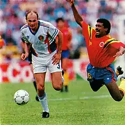 | Ігуаран (праворуч) проти Предрага Спасича на ЧС-1990 | ||||||||||||||||||||||||||