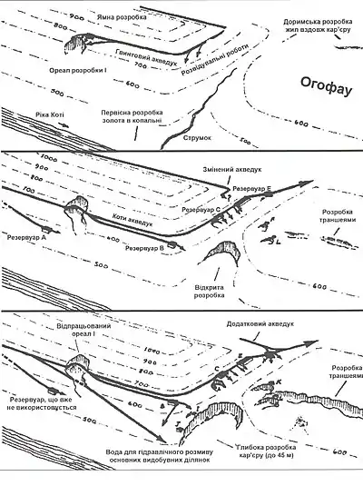 Перші арругії передбачали руйнування масиву за допомогою підземної розробки гірського масиву з наступним його розмивом.