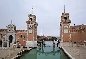 Головні ворота Арсеналу — Porta Magna, були збудовані близько 1460 і стали першою будівлею неокласицизму у Венеції. Вони ймовірно були збудовані Антоніо Гамбелло за проектом Якопо Белліні. Два давньогрецькі леви, розташовані по їх боках, були додані у 1687 році. На одному з них, відомому як Пірейський лев, викарбувані руни з часів набігів скандинавських найманців в 11-му сторіччі.