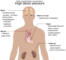Гіпертензія є найзначнішим фактором ризику передчасної смерті у цілому світі, якому можна запобігти.[19] Вона підвищує ризик ішемічної хвороби серця,[20] інсультів,[14] захворювання периферійних судин[21] та інших серцево-судинних захворювань, включаючи серцеву недостатність, аневризму аорти, поширений атеросклероз та тромбоемболію легеневої артерії.[14] Гіпертензія також є фактором ризику для розвитку когнітивних порушень, деменції та хронічного захворювання нирок.[14] Інші ускладнення: