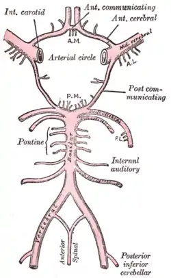 | Схема артеріального кровообігу основи мозку (артерія лабіринту позначена в центрі праворуч) | |