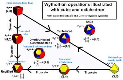 Різні архімедові і платонові тіла можуть бути отримані одне з одного за допомогою декількох операцій. Починаючи з платонових тіл, можна використовувати операцію зрізання кутів. Для збереження симетрії зрізання виконується площиною, перпендикулярною до прямої, що з'єднує кут з центром багатокутника. Залежно від того, наскільки глибоко виконується зрізання (див. таблицю нижче), отримаємо різні платонові і архімедові (й інші) тіла. Розширення або скошування здійснюється шляхом руху граней у напрямку від центра (на однакову відстань, щоб зберегти симетрію) і створенням, потім, опуклої оболонки. Розширення з поворотом здійснюється також обертанням граней, це ламає прямокутники, що виникають на місцях ребер, на трикутники. Остання побудова, яке ми тут розглянемо, це зрізання як кутів, так і ребер. Якщо нехтувати масштабування, розширення можна також розглядати як зрізання кутів і ребер, але з певним відношенням між зрізаннями кутів і ребер.