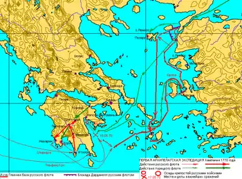 Успішний похід експедиції з Балтійського в Середземне море був полегшений сприянням Англії, яка здійснила тиск на Францію та Іспанію, які хотіли перешкодити перекиданню російських кораблів. 29 липня 1769 року 1-ша ескадра адмірала Г. А. Спиридова вийшла з Кронштадту та, досягнувши берегів півострова Морея, 28 лютого 1770 року разом із грецькими повстанцями заволоділа Містрою та Аркадією, а 21 квітня — фортецею Наварин, яка стала базою російського флоту.