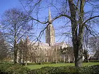 Характерним і довершеним зразком англійської готики став собор у Солсбері, вибудований у 1220–1270 роках. Він має план латинського хреста, розпластаний на землі, це тринавна базиліка. П'ятинавні базиліки у Британії не будували. Довжина собору у Солсбері — понад 140 метрів. Абсиди нема, замість неї прямокутна каплиця Богородиці. Трансептів не один, а два. Собор має декілька допоміжних прибудов — дворик (клуатр), каплиці, ризниця, капітул(зала зібрань). Усі прибудови — різні за формами і висотою. Композицію докупи збирає величезна вежа над середхрестям, шатровий дах якої плутають зі шпилем. Вежа над середхрестям разом з дахом-шатро сягає на 135 метрів і є найбільшою соборною вежею в Англії.