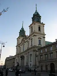 Єзуїтські церкви у Польщі будувалися за зразком головного храму Ордену єзуїтів — римського Іль Джезу у вигляді тринефної баневої базиліки з трансептом, у якої замість понижених бічних нефів були шереги капел. Класичним зразком такого костелу є Петропавлівський у Кракові, збудований у 1605—1609 рр. італійцем Дж. Тревано. Розвиваючись, цей тип був доповнений двома вежами, що фланкували західний фасад (костел камедулів у Кракові 1605—1630 рр.). За цим зразком у Польщі було зведено безліч костелів — як у великих містах, так і в малих парафіях (костел у Сейно другої половини XVIII ст.). Двовежовий костел Св. Хреста у Варшаві є зразком бароко кінця XVII ст. Його фасади вирішені здвоєними та строєними пілястрами римо-доричного (в першому ярусі) та коринфського (в другому ярусі) ордерів. Спокійне й стримане трактування фасадів контрастує з вишуканими бароковими вінчаннями двох веж, що фланкують головний фасад.