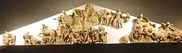 Зовнішні стіни як грецьких, так і римських храмів спочатку були багато прикрашені і барвисті, особливо на антаблементі і дахах; це ж було ще більш характерно для етруських храмів. Основи і капітелі дерев'яних колон часто були укладені в пофарбовану теракоту[10]. Всі краї даху прикрашались найчастіше яскраво пофарбованою теракотою, і, ймовірно, часто вздовж центрального гребеня даху розташовувався ряд скульптур, що виходили за групу акротеріїв над фронтоном у грецьких і римських храмах. Так, вважається, що Аполлон Вейський був частиною групи акротеріїв[11]. Багато пошкоджених залишків пізніх скульптурних фронтонів збереглися в музеях Італії та Греції. Зокрема, в містах Ортоново і Таламоне[12].