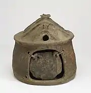 Зразки форми будинків простих етрусків видно на глиняному й іноді бронзовому посуді, званому «урнами» — найпевніше їх використовували для зберігання кремованого попелу, виявлених у похованнях віланової культури етруської залізної доби і раніших, особливо в північних районах[16]. На них зображено звичайні приміщення з єдиним внутрішнім простором. Вони здебільшого круглі або злегка овальні, часто з виступами дерев'яних балок, покладених у два ряди, які утворюють похилий дах, перетинаючись і виступаючи вгору у вигляді букви «V»; схоже, ці виступи іноді були різьбленими або прикрашеними якось інакше. На урнах завжди є великі квадратні двері для входу, іноді двоє; контур вікон у стінах може бути позначений виступами або відмітками на глині. Дуже часто над дверима на даху і з протилежного боку є вікно і вихід для диму[17].