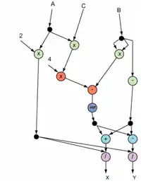 Вхідні дані А, B та C (коефіцієнти рівняння), подорожують графом, «перетворюючись» в результаті на шукані корені рівняння X та Y. Як бачимо, за умови наявності всіх операндів на момент започаткування обчислень, виконання обчислень може відбуватись одночасно у декількох напрямках на графі (оператори, що можуть за таких умов опрацьовувати операнди паралельно, забарвлені однаковим кольором). Навіть за умови, коли операнд не готовий, незалежні від цього операнда гілки обчислень все одно можуть виконуватись доти, доки обчислення на операційних пристроях-споживачах будуть незалежними від цього операнда. Також слід зазначити, що архітектури з керуванням від потоку даних є доволі незвичними у програмуванні, що у свою чергу є вадою у порівнянні з фон-нойманівськими архітектурами.