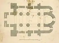 В архітектурі церкви втілилося дві концепції: трикамерна, яка була притаманна дерев'яним українським церквам, та тринавна із візантійської архітектури. Від моменту будівництва церква мала 17 саженів у довжину, складалася з абсиди та 4 рівновеликих у плані квадратних камер, розділених арками. На гравюрі Яна Конопацького середини XIX століття ще спостерігаються арки. Обіч двох середніх камер були вузькі нави, а з боків пресвітерію — закристія та скарбниця. Пресвітерій та квадрат середньої нави були перекриті куполами зі світловими ліхтариками — подібними до тих, які є на єдиній збереженій до сьогодні бані церкви. Нава і бабинець підпиралися контрфорсами, які і зараз спостерігаються обіруч вівтарної частини храму[16].