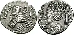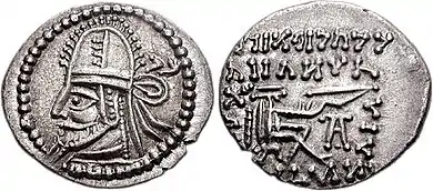 | Мітрідат (II) | Mihrdāt | бл. 123 — 88 | син Артабана I, з близько/до 109/108 р. до.н. е., після перемоги над сакаравлами та залучення їх до Парфянської держави на досить «пільгових» умовах (рід Сурена (правителі саків) оголошено другим після Аршакідів) прийняв титул «цар царів». Титулатура на монетах грец. ΒΑΣΙΛΕΩΣ ΒΑΣΙΛΕΩN ΜΕΓΑΛΟY ΑΡΣΑΚΟY ΕΠIΦΑNOYΣ | |